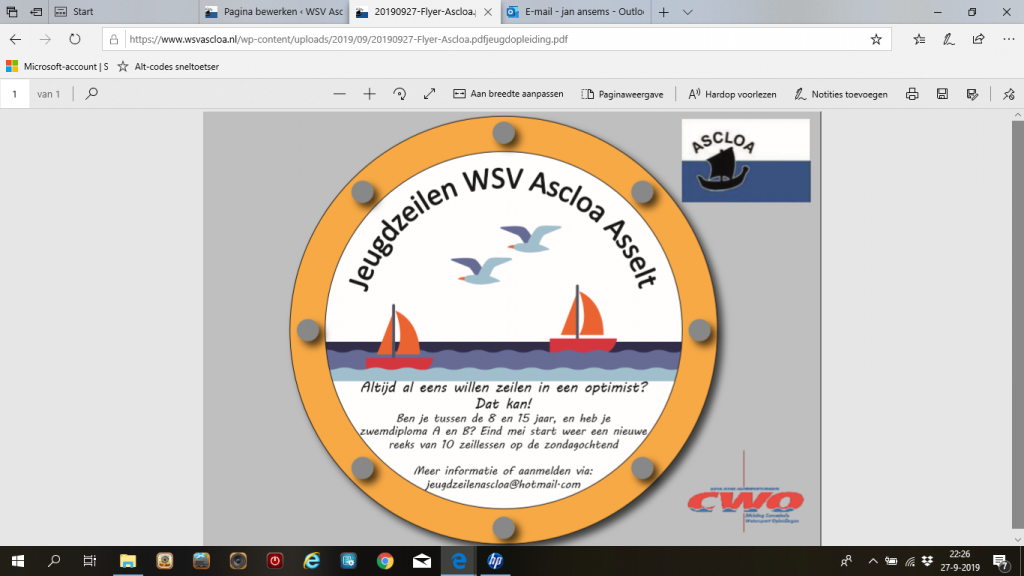 Bij Ascloa worden al vele jaren zeillessen voor de jeugd van Swalmen en omgeving gegeven. Daarvoor worden optimisten gebruikt. De zeillessen worden gegeven door ervaren en gediplomeerde instructeurs volgens het CWOsysteem. Dit is een landelijk erkende opleiding die met een diploma wordt afgesloten. Kinderen die aan deze zeillessen willen deelnemen ,moeten minimaal 8 tot maximaal 15 jaar zijn en zwemdiploma A en B hebben. De zeillessen worden gegeven op zondag morgen.